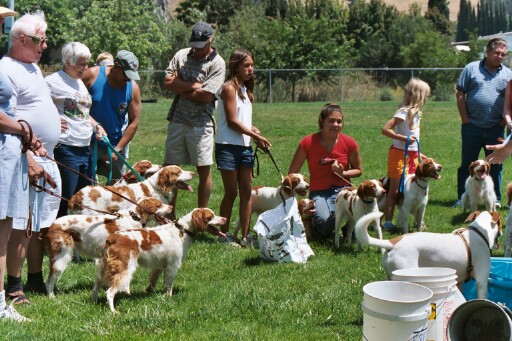 group of eager Brittanys (and a Pointer) await their turns at the "bobbing for hot dogs" contest